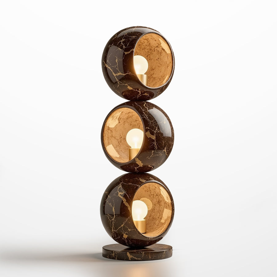 The lamp is crafted from high-quality Emperador marble, ensuring durability and strength. Each of the spheres has a polished, glossy finish, highlighting the natural veins of the marble and providing a visually striking appearance. The lamp's solid construction and stable base ensure its firmness and safety.