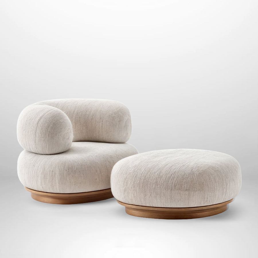 The Wood Nordic Couch features a modern and elegant design, characterized by its rounded and soft shapes. The style can be classified as contemporary with Scandinavian influences, evident in its simplicity and functionality. The wooden base adds a touch of natural warmth to the ensemble, creating a harmonious contrast with the boucle fabric. This couch is available in various options: just the couch, just the footrest, or both in a set, allowing it to adapt to different needs and spaces.