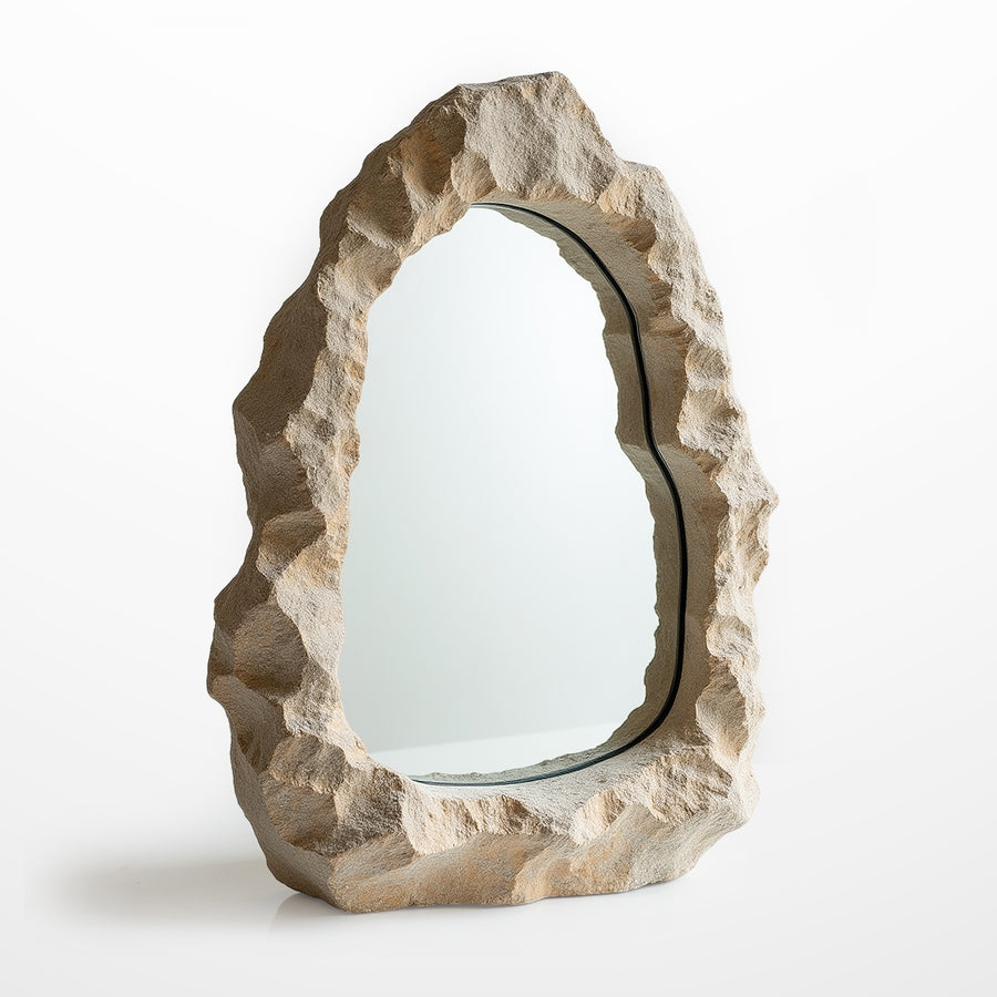This Athena's Wisdom features a rustic and organic design, reminiscent of a natural rock formation. The irregular and rugged shape of the frame gives the impression of being carved directly from stone, adding a unique and handcrafted character. This style can be described as "rustic contemporary," where the simplicity and authenticity of the material combine to create a striking and characterful decorative piece. The rough surface of the travertine and the irregular shape make each mirror unique, bringing a touch of naturalness and texture to any space. The simplicity of the design enhances the beauty of the mirror, allowing it to stand out as a focal point on any wall.