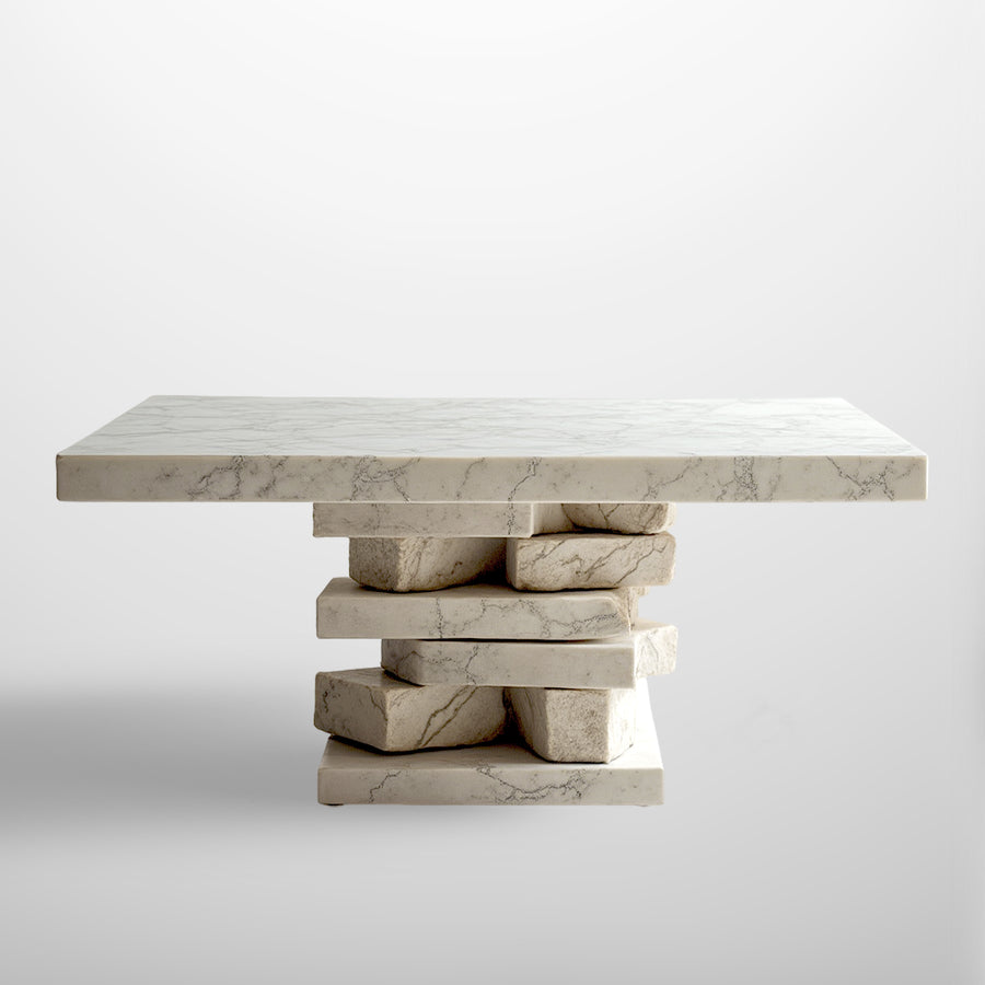 The Athamanon Table is a masterpiece of contemporary design. Its unique structure consists of a rectangular marble tabletop resting on a sculptural base formed by stacked marble blocks arranged in an apparently random fashion. This arrangement creates a fascinating contrast between stability and dynamism, giving the table a robust yet sophisticated appearance. The style of this table can be classified as contemporary sculptural design, where functionality is combined with bold artistic expression.