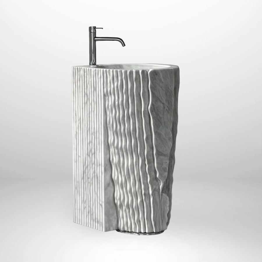 The Marble Sink showcases a modern and sculptural design, distinguished by its unique texture and imposing appearance. The sink features a cylindrical shape with an exterior finish that mimics natural waves or folds, giving it an organic and tactile look. This design makes it a centerpiece in any bathroom, seamlessly blending functionality with artistry. The style of the sink is clearly contemporary, with influences that draw inspiration from nature, making it suitable for minimalist spaces as well as more elaborate environments. Additionally, its elegant marble finish adds a touch of luxury and sophistication.