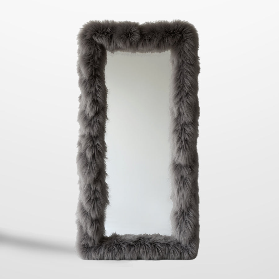 This Marella Mirror features a bold and contemporary design, highlighted by its striking frame covered in dark grey synthetic fur. Its rectangular and vertical shape, combined with the furry texture, creates a unique piece that adds a touch of luxury and extravagance to any space. The style of this mirror can be described as modern glamorous, perfect for those looking for a decorative piece that stands out and adds character to the room. The combination of its simple shape with the fur finish makes it both functional and decorative.