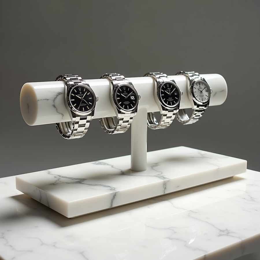 This Guardian of Time features a minimalist and sophisticated design. Its simple yet functional structure consists of a solid rectangular marble base, supporting an elevated horizontal cylinder on a central stand, specifically designed to display wristwatches in an organized and attractive way. The white marble with its natural gray veining provides a striking visual contrast to the watches, highlighting their design without overpowering them. The style of this piece can be described as "luxury minimalism," where simplicity in form is paired with the richness of the material.