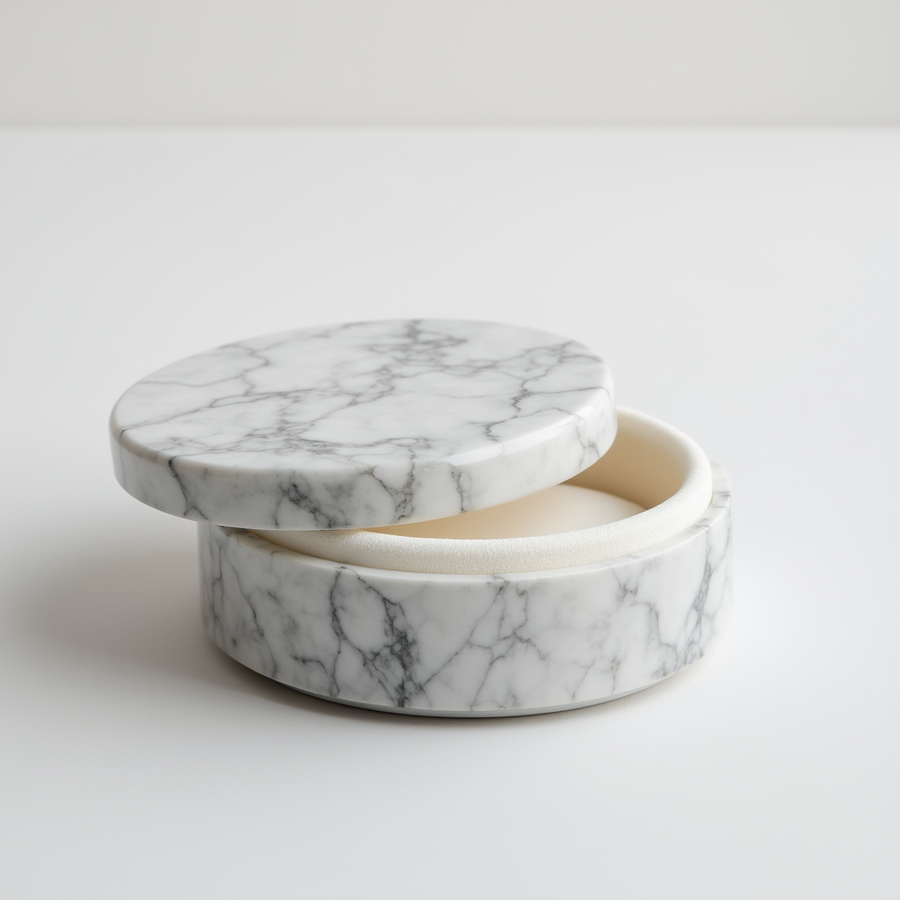 The quality of this box is outstanding, made from genuine Carrara marble, known for its durability and strength. The finishes are impeccable, with perfectly polished edges that provide a smooth feel to the touch. The lid fits precisely, ensuring the box stays securely closed.