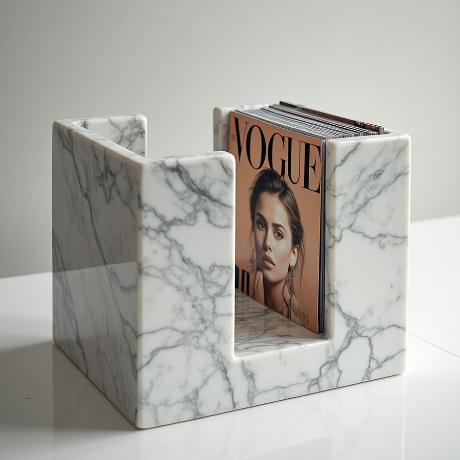This Stone of Letters features a modern and functional design, with a rectangular structure open at the top that allows for organized and accessible magazine storage. The clean, minimalist lines, combined with the white marble and its distinctive gray veining, give it a sophisticated and luxurious look. The central opening makes it easy to remove and place magazines, while the solid sides add stability and character to the piece. This magazine holder can be classified as "modern minimalism," thanks to its simple yet impactful design that stands out in any decorative setting.