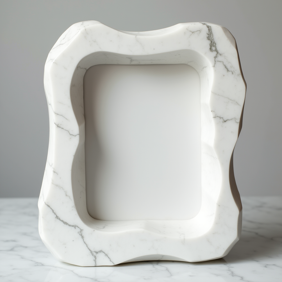 This Lian Frame features a unique and sculptural design, characterized by its wavy edges and organic forms. Unlike conventional frames with straight lines, this piece embraces a more fluid and free aesthetic, bringing dynamism and sophistication to any space. The soft gray veins running through the white marble accentuate the curves of the design, creating a sense of movement. This style could be described as "contemporary organic," a fusion of natural and modern elements, perfect for those seeking a piece that combines art and functionality in their home decor.