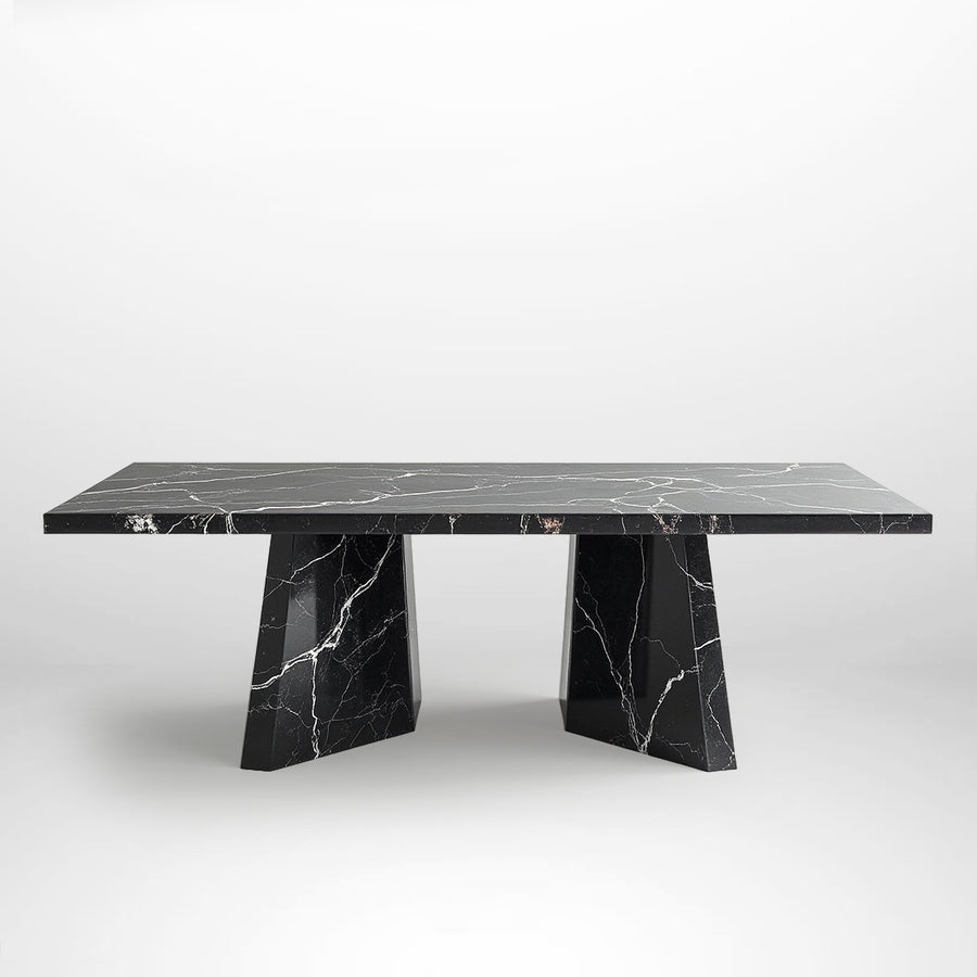 The Negro Marquina marble used in this table is of premium quality. Its distinctive black color with natural white veining offers a unique aesthetic that stands out in any space. The polished surface is easy to clean, requiring only a damp cloth to remove dust or debris. Additionally, the marble is heat-resistant, making it a practical choice for dining rooms. The geometric marble legs provide robust support while also reinforcing the modern aesthetic of the table.