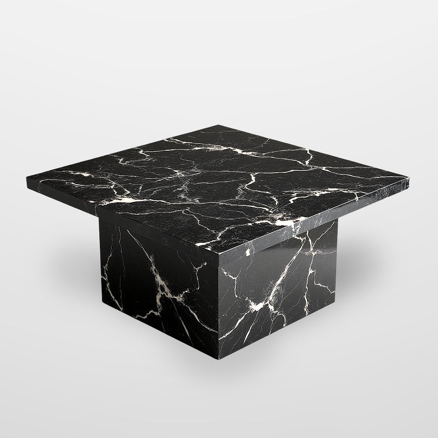 The Black Mirage Marble Table is a standout example of contemporary design with a touch of classic luxury. The table features a robust square shape, with a thick marble tabletop supported by an equally solid base. The white veins running through the black marble create a striking and elegant contrast, accentuating the minimalist aesthetic of the piece. This design falls within the contemporary style, where the simplicity of forms is combined with the opulence of materials to create a piece of furniture that is both functional and visually impactful.