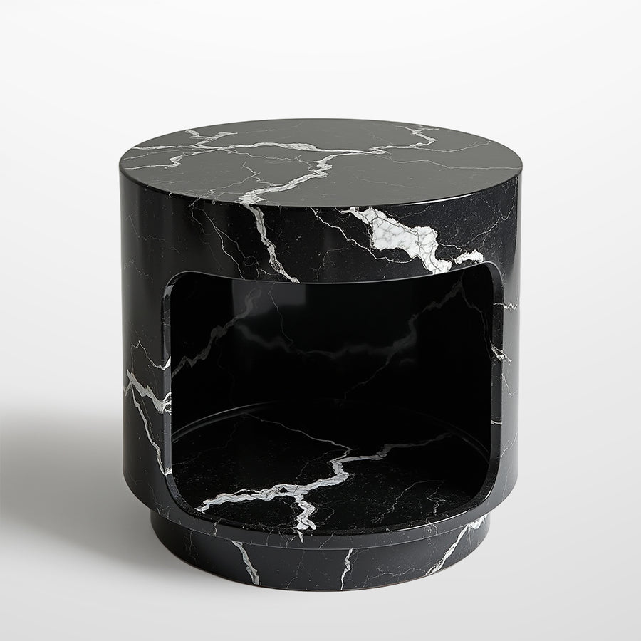This Eros of Tranquility Table features a contemporary and sophisticated design, characterized by its round shape and smooth lines. The open section at the bottom adds extra storage space, providing both functionality and aesthetics. The circular design, with perfectly curved edges, gives it an elegant and modern look, ideal for minimalist environments seeking unique and striking pieces. This style is defined as contemporary, with clear inspiration from simplicity and organic forms.