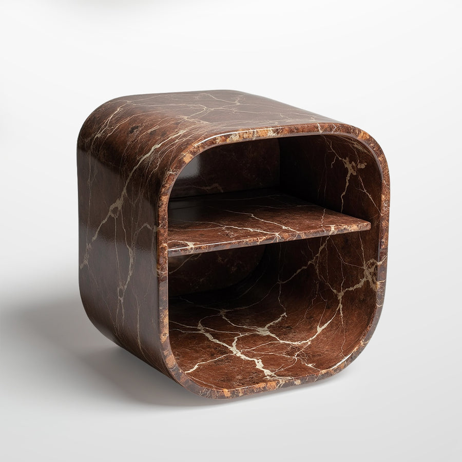 This Hipnos of Luxuries Table features a modern and functional design with a retro touch due to its curved shapes and enveloping structure. The table has a rectangular shape with rounded edges, giving it a soft and elegant appearance. Its design includes an open space with an intermediate shelf, ideal for storing items in an organized manner. This style falls within the modern-retro design, making the table a perfect piece for contemporary interiors that seek to combine functionality and aesthetics.