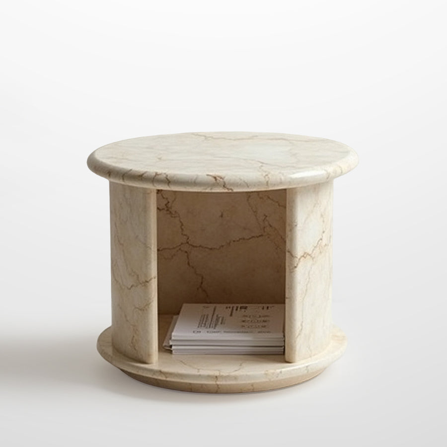 This Nyx of Dreams features an elegant and functional design that combines the sophistication of marble with a classic and versatile style. The cylindrical base, along with the open shelf, provides practical space for storing small items, adding a touch of functionality to its design. The round tabletop has a slightly rounded edge, adding softness to its lines. The style of this table can be described as classic contemporary, ideal for complementing both modern and traditional interiors.