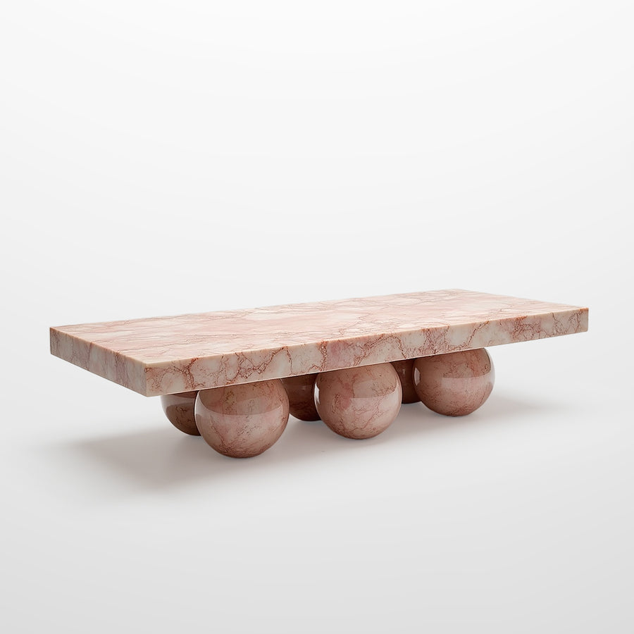 The quality of this table is exceptional, crafted from high-grade Rosa Portugues marble. Each sphere and the tabletop have been sculpted with precision, showcasing impeccable finishes and a polished surface that highlights the natural elegance of the marble. The stability of the table is ensured by the solid design of its bases, while the carefully crafted details reflect a high level of craftsmanship.