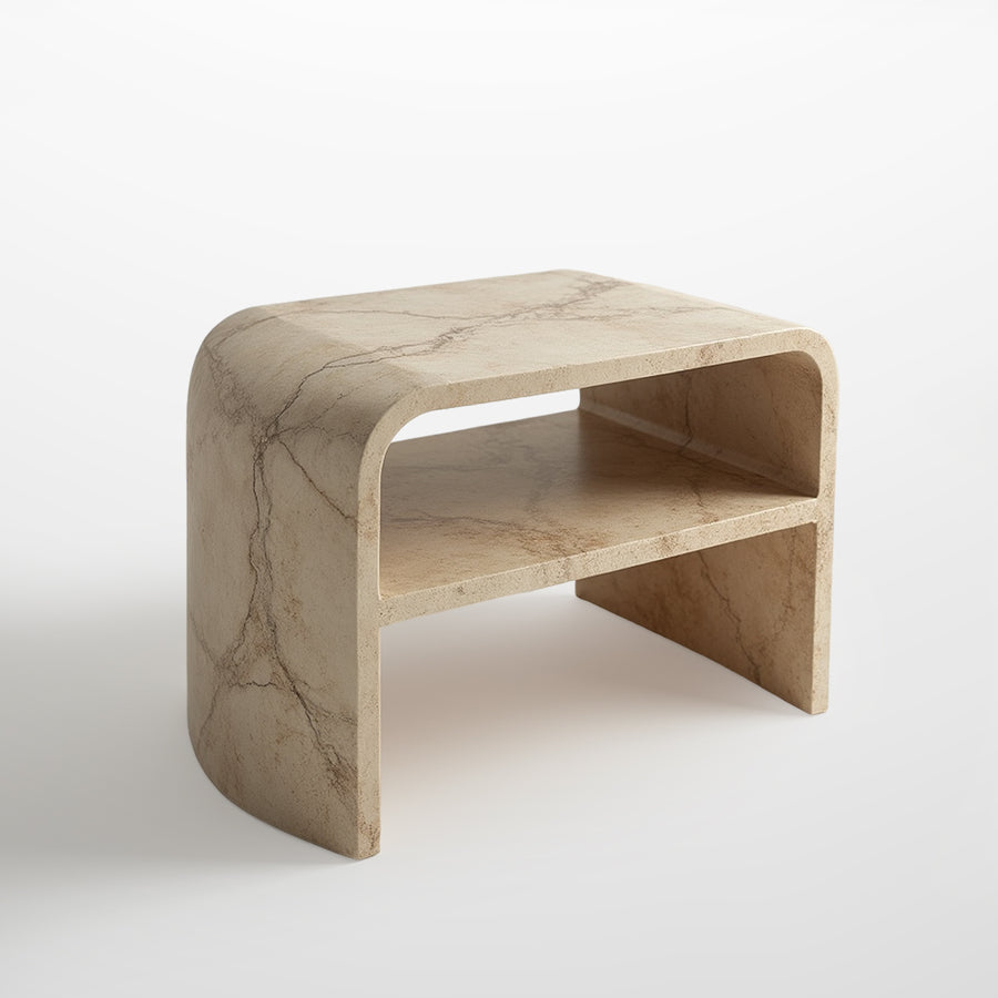 This Somnus of Ecstasy Table features a minimalist and functional design, perfect for modern spaces seeking a clean and elegant aesthetic. Its rectangular shape with softly rounded edges and open structure gives it a light character, despite being made of solid marble. The table includes a lower shelf that adds functionality by providing additional storage space. The style can be classified as contemporary, with a clear influence from Scandinavian design, which prioritizes simplicity and natural beauty.