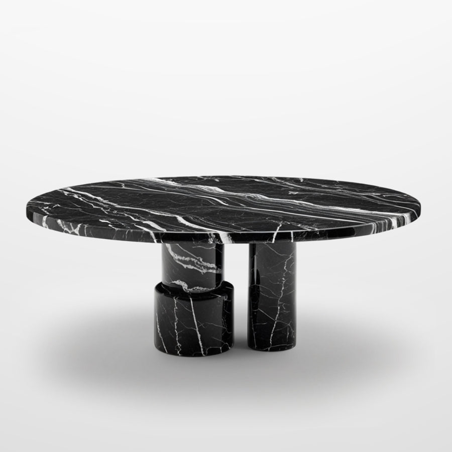 This Big Ben Night boasts an elegant and modern design, with a round surface highlighted by natural white veining that contrasts beautifully with the black marble. The base consists of two cylindrical marble columns, giving the piece a sculptural and solid character, adding an architectural touch to its design. The style of this table can be described as contemporary minimalist, ideal for sophisticated and modern spaces seeking a balance between functionality and luxury.