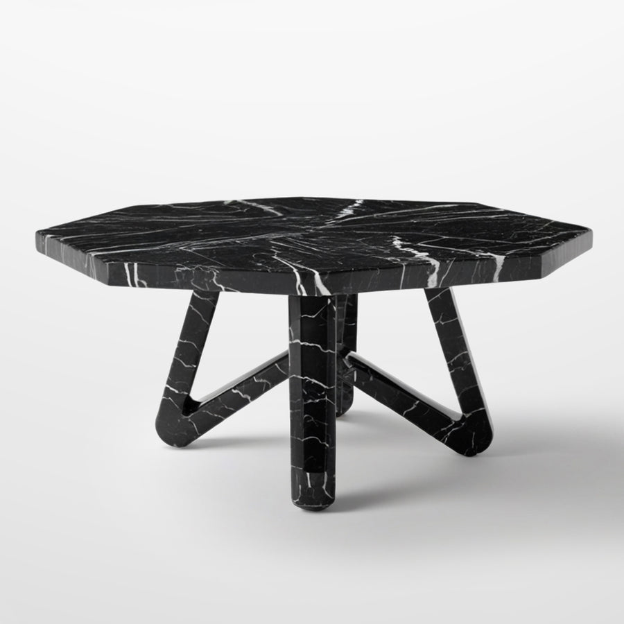This Dark UFO features a modern and distinctive design, with an octagonal shape that adds a contemporary geometric touch. The black marble with natural white veining stands out across the surface, creating a striking visual contrast. The table legs are also made of marble, forming a solid base with an interwoven design that provides stability and a sculptural appearance. The style of this table can be described as minimalist and modern, making it perfect for elegant and sophisticated spaces.