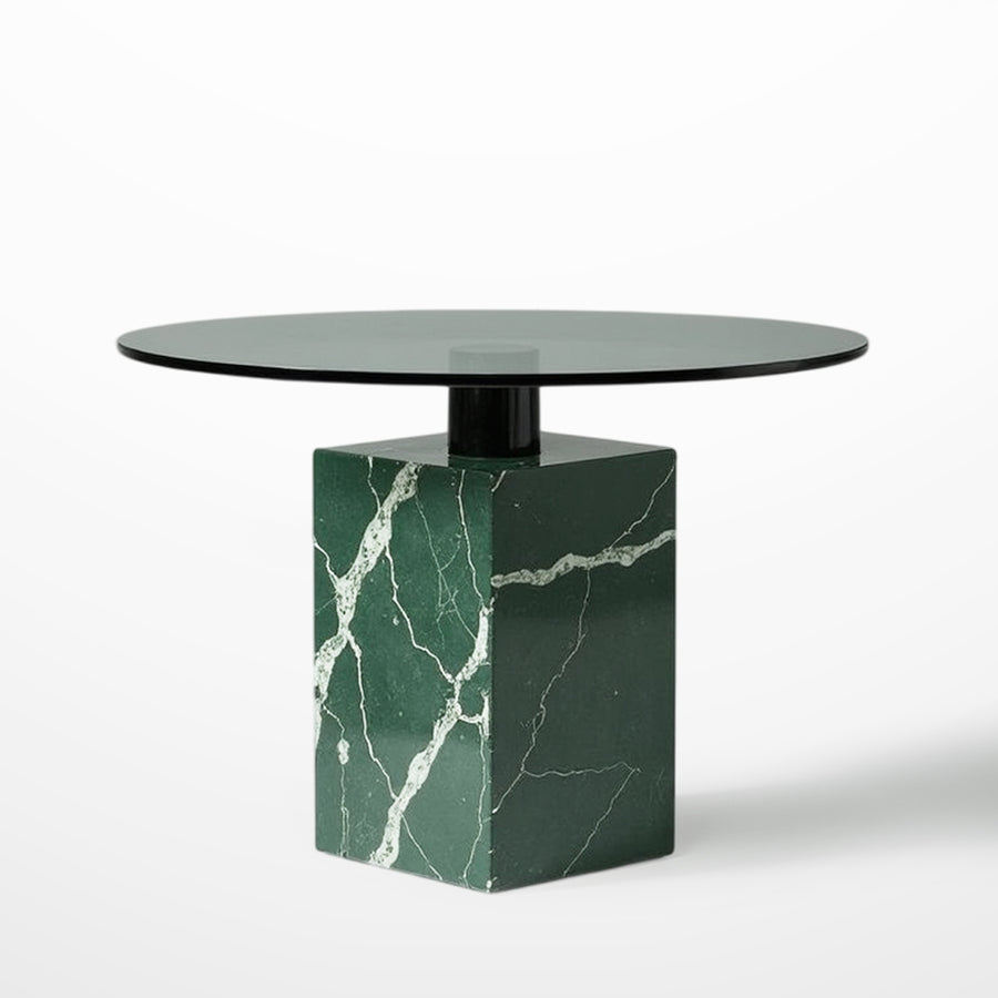 The table base is crafted from Green Alpi marble, known for its robustness and its distinctive green color with white veining, adding a touch of luxury and exclusivity. The high-quality tempered glass surface offers excellent transparency and durability. This table is easy to clean; a damp cloth is enough to maintain the marble's shine and the glass's clarity, with no need for harsh cleaning products. The combination of these materials ensures both sophisticated aesthetics and easy maintenance.