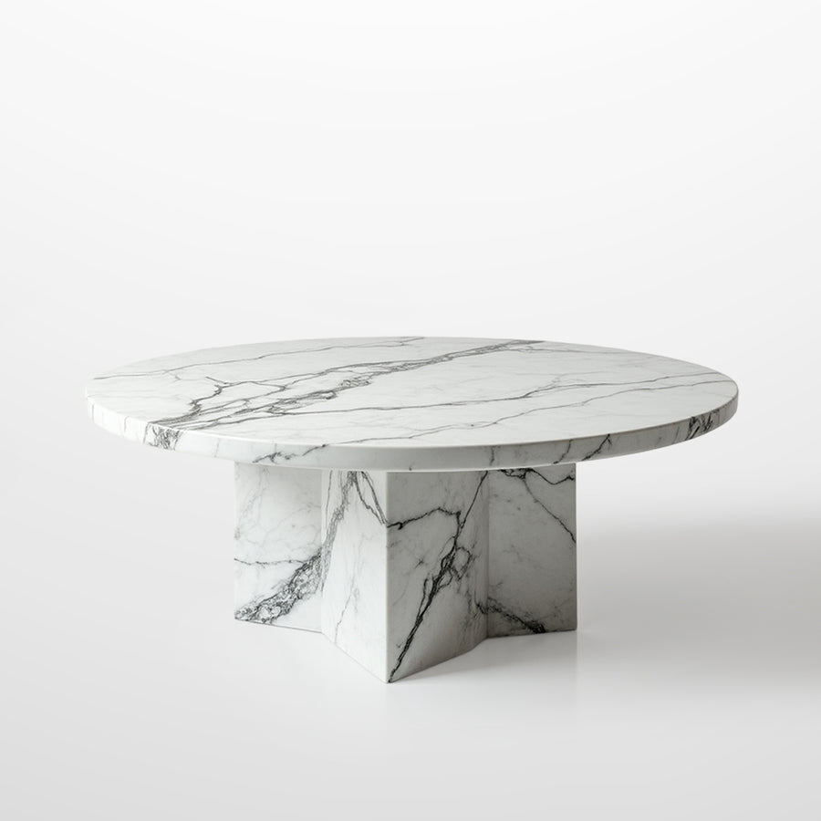 This Gaia Carrara Table stands out for its minimalist and elegant design, featuring a round tabletop and a solid, clean-lined geometric base. Inspired by a "contemporary minimalist" style, the table showcases the natural beauty of the marble, with gray veining flowing across its white surface. Its simple yet sophisticated design makes it a versatile decorative piece, ideal for both dining rooms and living spaces. The table is available in two sizes: 80 cm and 100 cm in diameter, allowing it to fit various spaces and design needs.