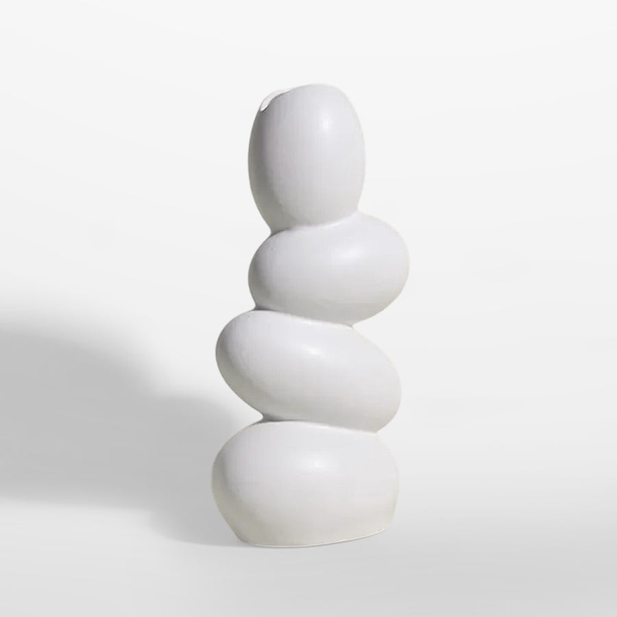 This Aura Vase stands out for its modern and minimalist design, inspired by organic shapes that resemble a stack of smooth stones. Its vertical and curvaceous structure makes it an eye-catching and elegant decorative piece, perfect for contemporary spaces. The matte white finish reinforces its minimalist style, offering a sense of serenity and purity, making it an ideal addition for decorating spaces with a Scandinavian or modern aesthetic.