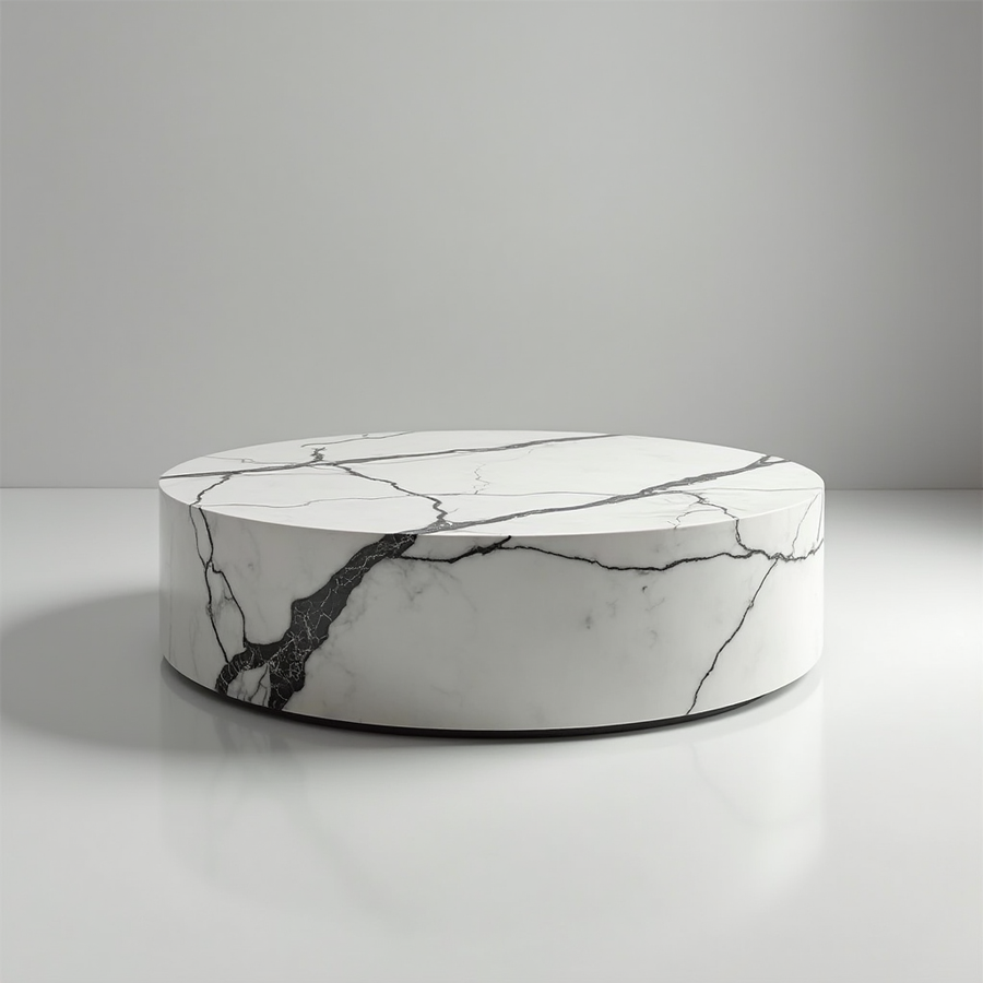 This Atlas Arabescato Table stands out for its minimalist and contemporary design, characterized by its circular shape and clean lines. Its style is defined as modern with a luxurious touch, thanks to the prominent black veining that runs across the white surface, creating a visually striking contrast. The cylindrical structure and polished finish give it a sophisticated look, making it a perfect fit for elegant and modern spaces.