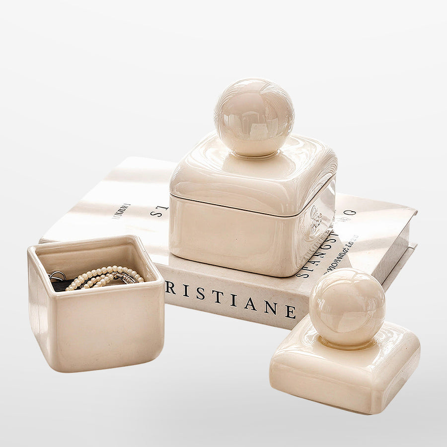 These Bianca Jars feature a modern and minimalist design, characterized by their square shape with rounded edges and a lid topped with a perfectly polished sphere. The style of these jars can be described as contemporary with a touch of classic elegance, making them suitable for decorating any space, whether in the bathroom, kitchen, or living room. The smooth lines and simple shapes provide a sophisticated and refined look. There are three options available: a larger version and a smaller version, offering options for different storage needs. They can also be purchased together.