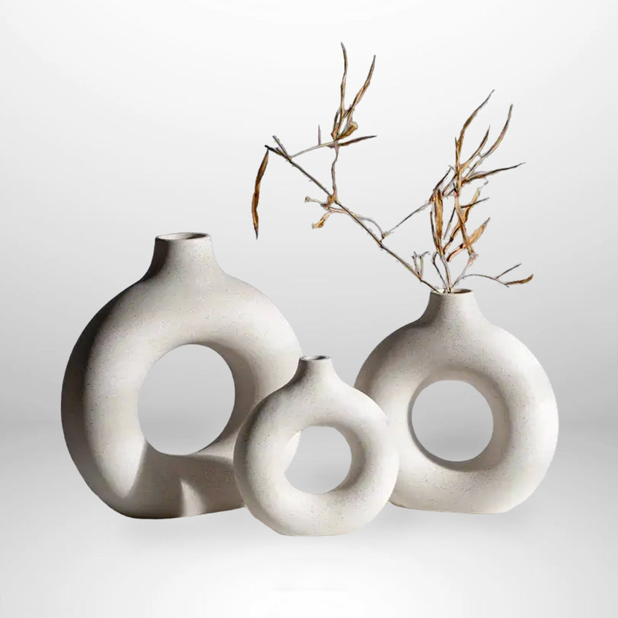 This Hera Vase features a minimalist and modern design that stands out due to its circular shape with a large central opening, giving it a unique and sculptural appearance. The simplicity of its form, combined with clean lines, makes it an ideal piece for contemporary interiors. Its rounded silhouette not only adds an interesting visual element but also allows light to pass through the central opening, creating an appealing play of shadows in the space where it is placed. This design aligns with the Scandinavian style, characterized by a focus on functionality, simplicity, and the natural beauty of materials.