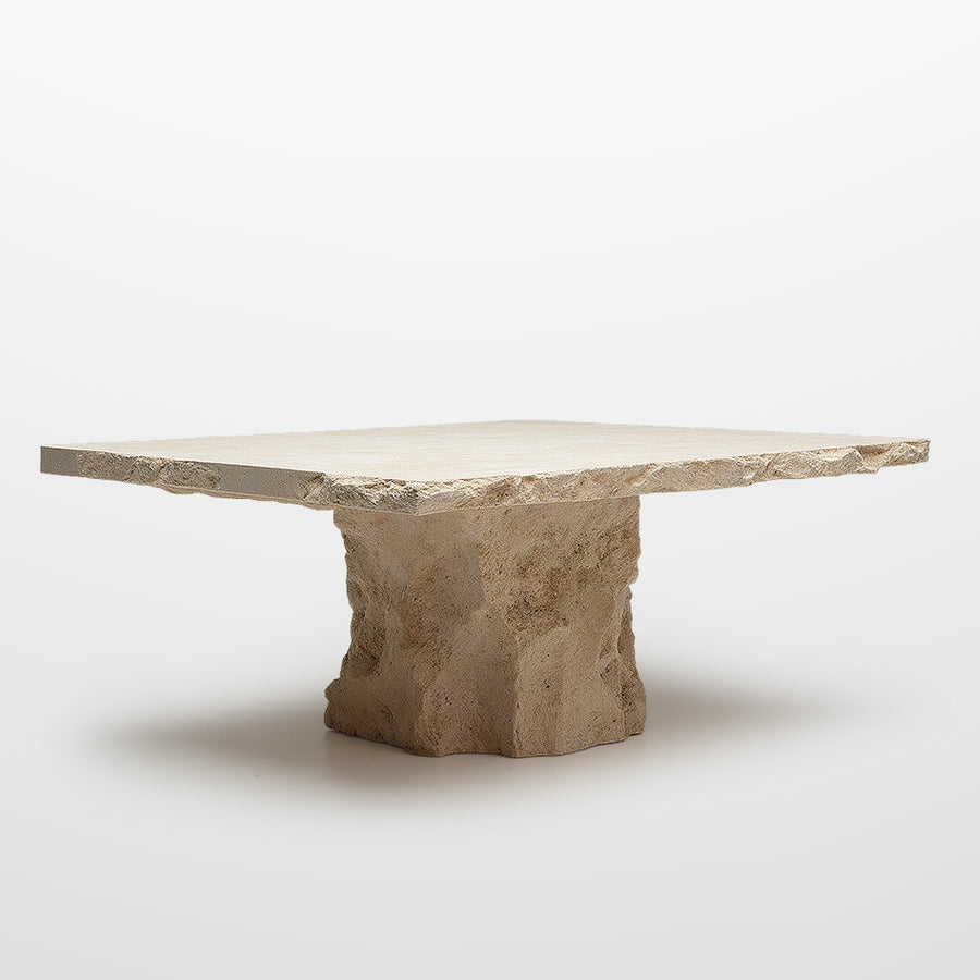 This Pietra Bruta Dining Table features a design that blends rusticity with sophistication. The base of the table, sculpted with a rough and organic finish, evokes untreated natural stone, while the top surface is smooth, creating an intriguing contrast between the raw and the polished. This table's style can be associated with brutalism, an architectural and design movement characterized by its focus on material honesty and robust forms. The table's square shape makes it ideal for modern and minimalist spaces, adding a sculptural touch to any environment. The raw edges of the travertine on the tabletop maintain an authentic character, enhancing the natural and raw design of the piece.
