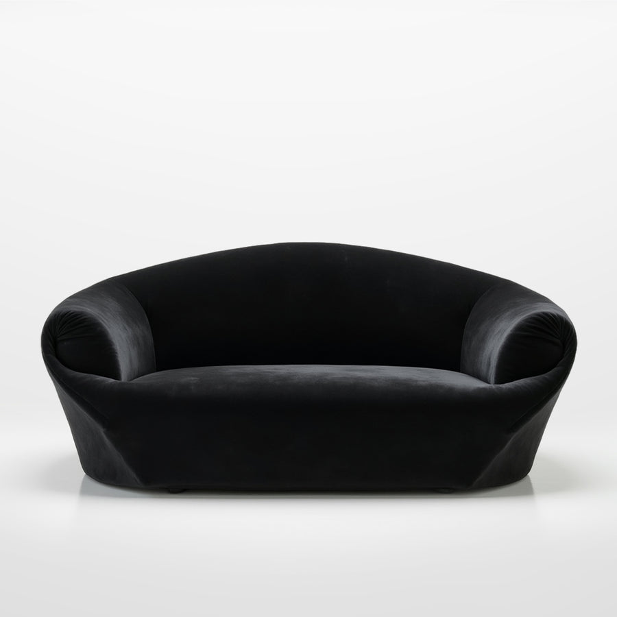 This Salem Game features a modern and elegant design, highlighted by its enveloping shape and smooth lines. Inspired by contemporary style, its curved and low structure creates a cozy and sophisticated atmosphere. The slightly inward-sloping arms provide a sense of intimacy and visual comfort. Upholstered in luxurious velvet, the sofa exudes an air of opulence, while its curved back adds a sculptural touch, making it a perfect centerpiece for any modern living room.