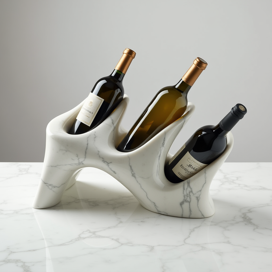 This Sileno boasts a sculptural and modern design, featuring fluid and organic lines reminiscent of a contemporary art piece. The undulating, curvaceous structure is designed to hold three wine bottles at an angle, not only allowing easy access but also elegantly displaying the bottles. The white marble with natural gray veining adds a touch of luxury and sophistication, making this wine rack a focal point in any space. This style can be described as "functional art," where aesthetics and functionality are seamlessly blended. Its modern and sculptural design, combined with high-quality materials, makes it an ideal choice for those looking to add a touch of sophistication and style to their wine presentation.