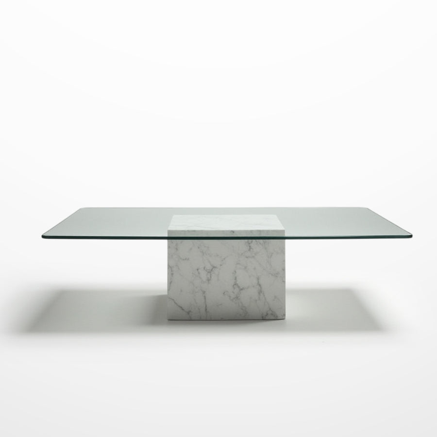 The base of this table is made from Carrara marble, a natural material appreciated for its white tone and subtle gray veining, which adds a touch of distinction to the piece. Its polished finish enhances the marble’s natural beauty and makes it easy to clean, requiring only a damp cloth to maintain its shine and elegance without the need for harsh products. The high-quality glass top guarantees impeccable transparency and is easy to clean, preserving its sophisticated appearance with minimal effort. The combination of marble and glass ensures that this table is a durable, low-maintenance piece.