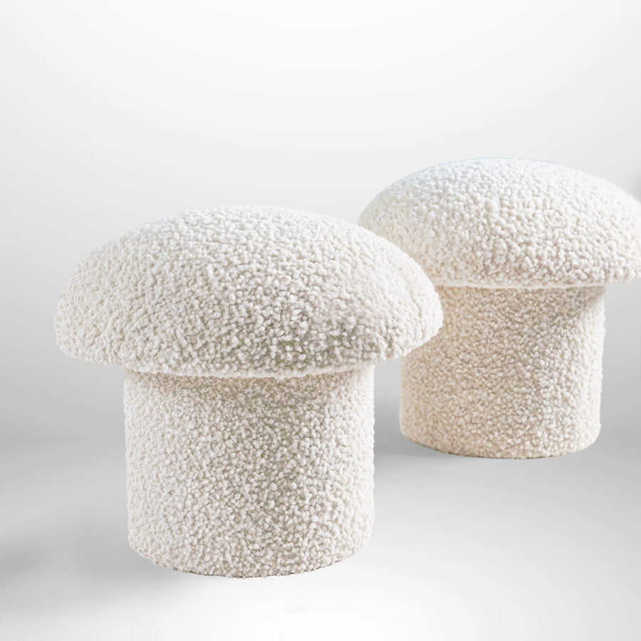 The Mushroom Stool features a unique and striking design inspired by the shape of a mushroom, giving it a playful and organic character. Its structure consists of a sturdy cylindrical base and a rounded, padded seat that extends outward, mimicking the shape of a mushroom cap. This style can be classified as contemporary with a naturalistic influence, as it combines the functionality of furniture with a design inspired by nature. The soft and cozy appearance of the bouclé fabric accentuates the rounded form, making this stool both a decorative and functional piece, perfect for adding a touch of originality to any space.