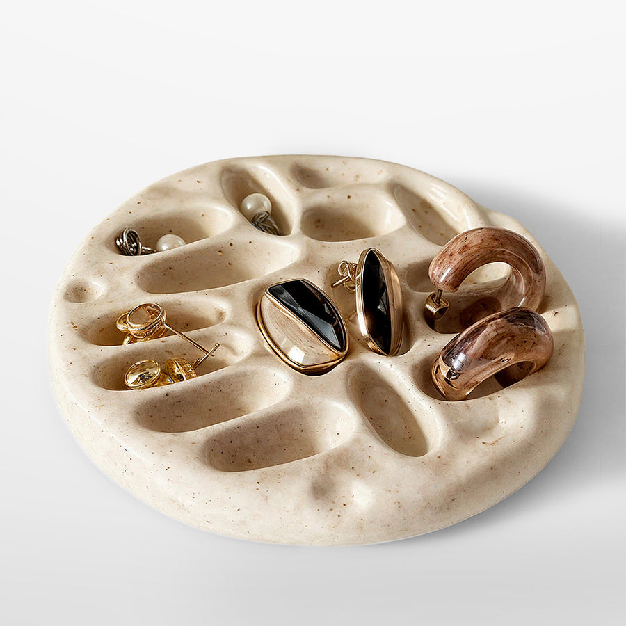 The Rings Tray boasts a modern, minimalist design, with an organic and flowing shape that features multiple compartments. Its structure allows for organizing small items like earrings, rings, and other accessories in an aesthetically pleasing and functional way. The neutral tones of the ceramic make it versatile and easy to incorporate into various decor styles, whether on a vanity, dresser, or entryway table. The piece's simplicity and elegance make it an excellent accent for contemporary spaces.